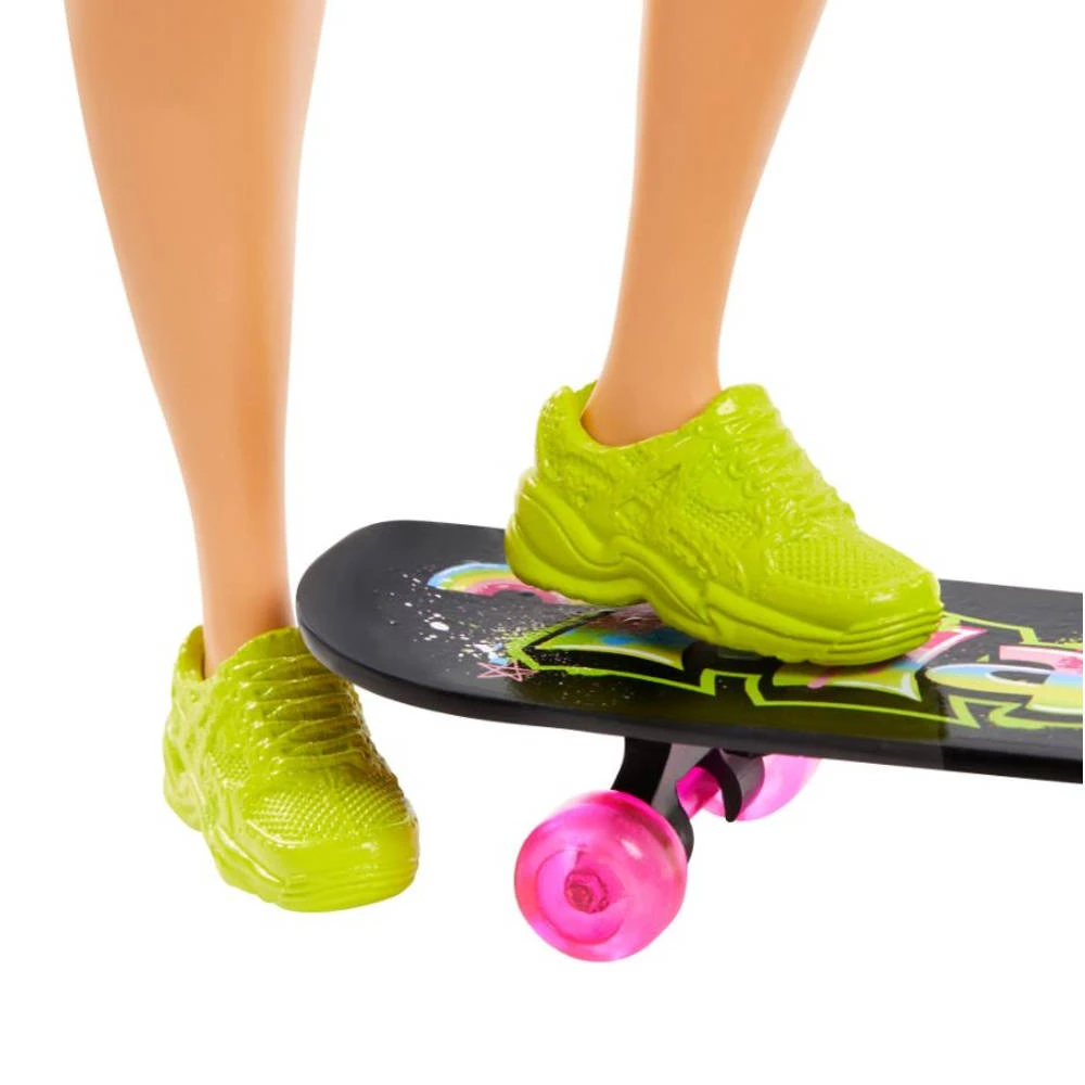 Je Barbie-verhalen speel je eenvoudig na met deze Barbie extra pop met blauw afrohaar. Deze Barbie heeft een meer curvy-lichaam dan de originele pop en haar haarstijl met een zee van blauwe krullen en een trendy knotje is een waar kunstwerk. De leuke en speelse look laat haar eigen zelfverzekerde stijl zien. Ze draagt een tie-dye topje en witte shorts met daaroverheen een blauw bomberjack met oranje voering en een echt werkende rits. De accessoires van Barbie zijn een skateboard met Malibu-print en roze wielen, een neongroen heuptasje, een zilverkleurige zonnebril, ‘Girl Power’ oorbellen, een hoofdtelefoon en neongroene sneakers. Deze maken haar look extra persoonlijk. De twee witte kittens met hun gouden kroontje en die guitige uitdrukking op hun snuitje zijn ook superschattig. Maar wat nóg leuker is, ze kunnen ook op het skateboard rijden!