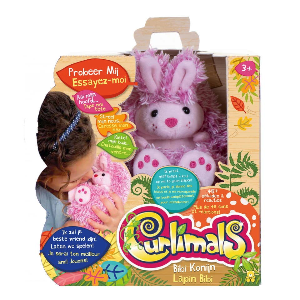 Kinderen kunnen fijn spelen met Curlimals Bibi konijn. Bibi is het liefste konijntje dat je ooit zult ontmoeten. Bibi ziet eruit als een zacht bolletje, maar als je haar wakker maakt rolt ze zich uitrollen en laat haar lieve snuitje zien. Bibi wil graag met je spelen, tegen je praten en je kusjes geven. Ze houdt van kietelen en giechelen en maakt allerlei bewegingen. Bibi is voorzien van wel 45 geluidjes en reacties. Streel haar neusje, dan gaat ze niezen en zich weer oprollen. Bibi is de liefste knuffel die er is!