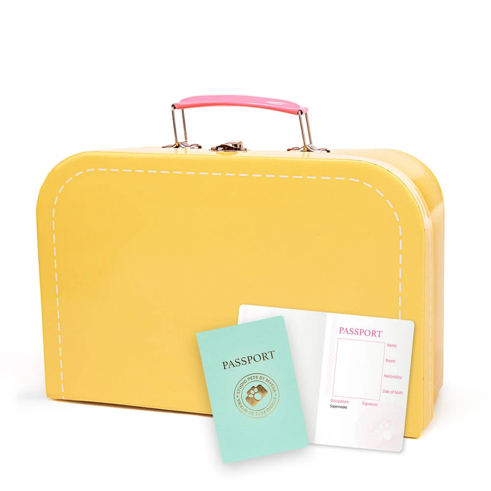 Deze prachtige gele koffer is uitermate geschikt voor een Studio Pets knuffel van 23 cm. Op die manier kan je je favoriete knuffel gemakkelijk overal mee naar toe nemen. De koffer wordt geleverd met een blanco paspoort speciaal voor jouw knuffel. Het koffertje is gemaakt van hoge kwaliteit karton.