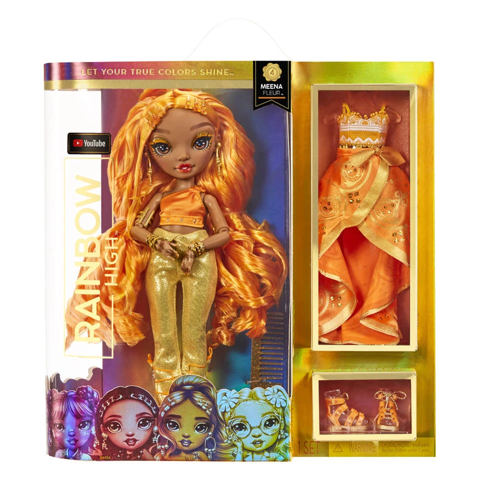 Ben je net zo modebewust als de Rainbow High modepop Meena Fleur? Deze saffraangouden modepop is inclusief wel 2 coole designer-outfits. Mix en match deze outfits met de meegeleverde accessoires en laat je creativiteit daarbij de vrije loop. Deze pop is superleuk voor kinderen om hun eigen creatieve avonturen mee te bedenken. Meena komt uit New Delhi, India, en deelt graag haar culturele erfgoed met haar vriendinnen, zoals de mehndi-lichaamskunst op haar handen. Meena is gericht op Accessoire-ontwerp en ze is dol op het maken van speciale juwelen om haar modieuze outfits te verfraaien. Ze draagt een top met blote schouder en siernagels, een metallic goudkleurige broek met geregen koord op de kuit, platformschoenen en traditionele Indiase juwelen. Haar tweede outfit is een top met kwastjes, een wikkelrok met lovertjes langs de randen, vetersandalen en bijpassende juwelen.